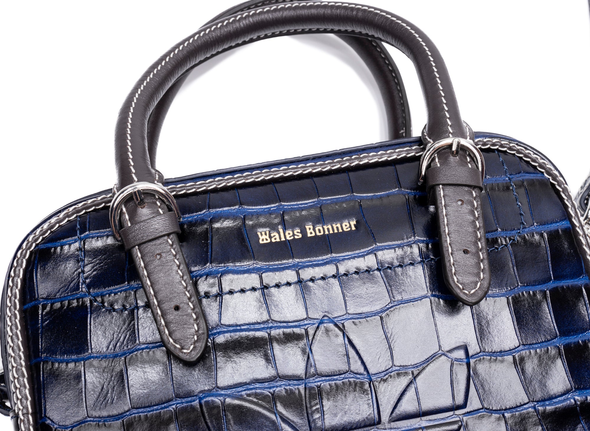 The Wales Bonner Small Bag is expertly crafted with premium leather material detailed with a crocodile pattern. Both the handles and the shoulder strap are adjustable, and it's finished with a double zip opening and a gold foil Wales Bonner logo.