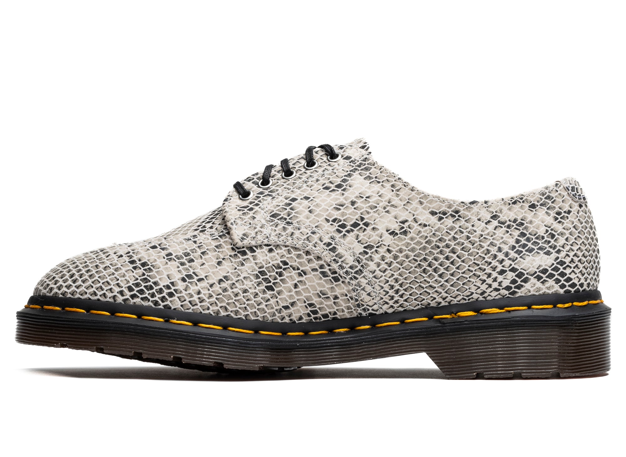 The 2046 shoe dates back decades: a tapered 5-eye silhouette with a sleek, refined profile. This season the Archive style returns in a statement Python Print Suede. The shoe is detailed with silver eyelets and is marked by our signature yellow welt stitching. It stands on our retro brown outsole with a distinctive DM's tread pattern.