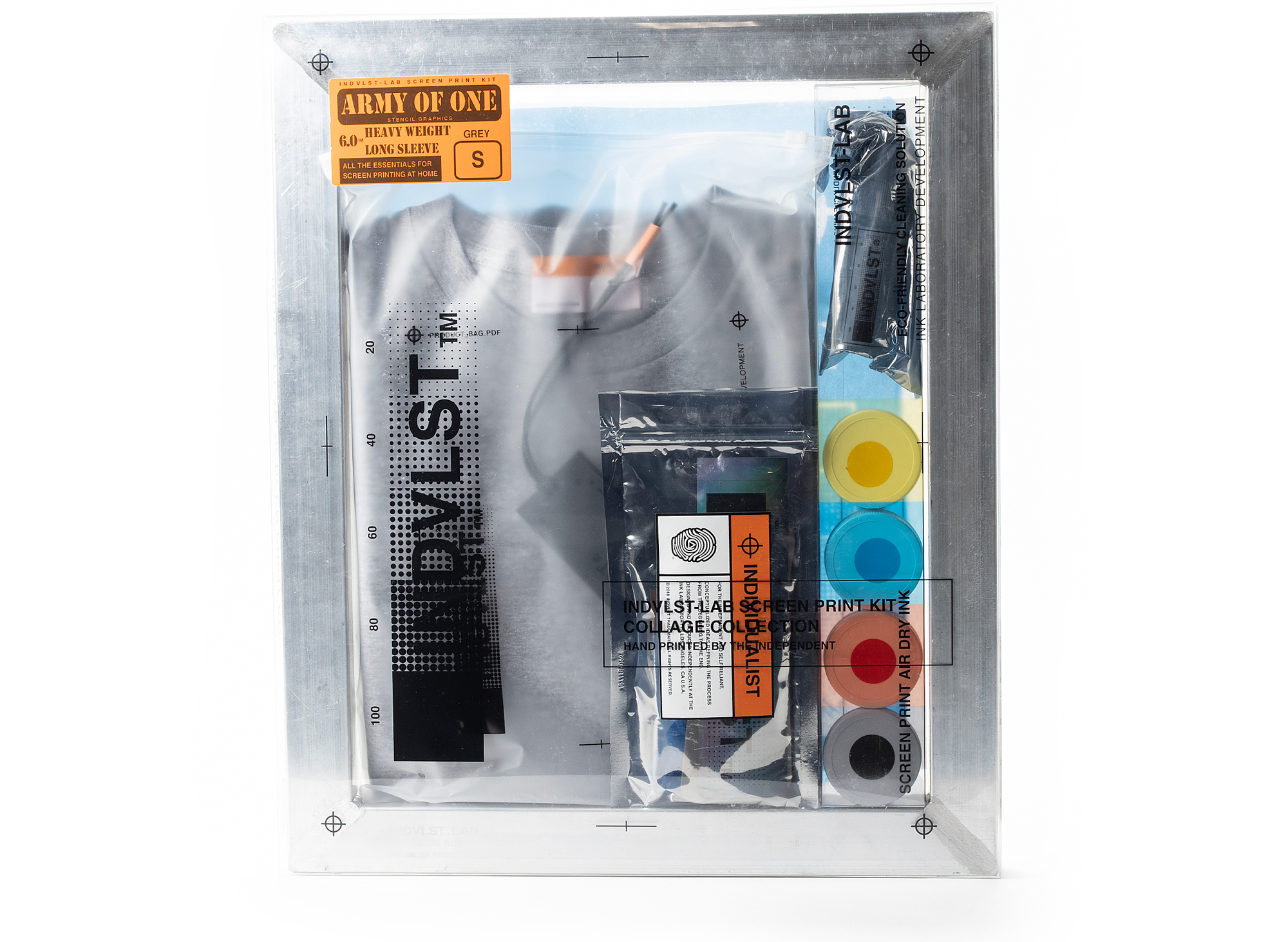 INDVLST-LAB Screen print kit including a 6 step instruction and all the elements for print design in the comfortably of your own home. Soap, water, & blow dryer not included.